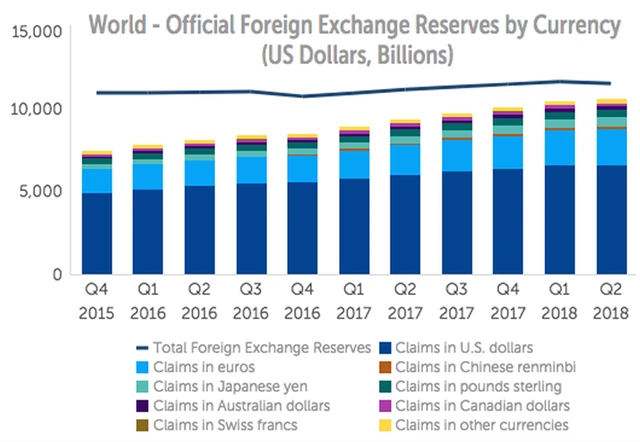 Dolar nadále s náskokem vládne rezervám centrálních bank (62,3 %), jeho pozice je nicméně nejslabší od roku 2013. Jüan, ve srovnání s americkou měnou stále trpaslík, naopak ve druhém čtvrtletí opět posílil, a to z 1,4 % na 1,8 %, navzdory znehodnocení o 5 %, což je výrazný signál, říká Steven Englander, která šéfuje forexovým analytikům se zaměřením na měny zemí G10 v bance Standard Chartered.