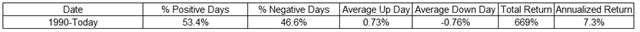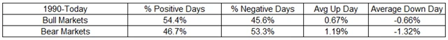 Všeobecně převládá názor, že ceny akcií většinou rostou, takže při poklesech, zejména těch výraznějších, mají investoři pocit, že je něco špatně. Ve skutečnosti ale poklesy na trzích nejsou nijak výjimečné. Od roku 1990 byl poměr růstových a poklesových dnů na americké burze 53,4 % k 46,6 % ve prospěch růstů. Takže na denní bázi je výsledek téměř jako u hodu mincí. V růstových dnech je navíc průměrný denní výnos 0,73 % a v těch ztrátových -0,76 %. Za 29 let tak bylo na trzích pouze o 500 více růstových dní. Index S&P 500 za tu dobu ale zvládl přidat (bez dividend) 669 %.