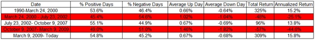 Sledované 29leté období lze rozdělit na kratší býčí a medvědí trendy, kdy docházelo ke změně podílu plusových a mínusových dnů, ovšem průměrné výnosy a ztráty zůstávaly v rámci jednoho období podobné.