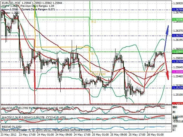 Předpokládaný pohyb pro dnešní den SHORT. Případné vstupy do obchodu z hladiny 1.2595 s předpokládaným cílem 1.2545 případně až 1.2495. Proražení hladiny 1.26 může vést k pohybu s pravděpodobným cílem 1.2645 až 1.2685.