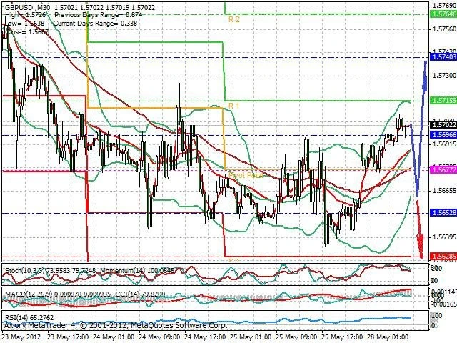 Předpokládaný pohyb pro dnešní den LONG. Případné vstupy do obchodu z hladiny 1.566 s předpokládaným cílem 1.574, případně až 1.5785. Proražení hladiny 1.566 může vést k pohybu s pravděpodobným cílem 1.5625 až 1.56.