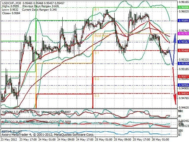 Předpokládaný pohyb pro dnešní den LONG. Případné vstupy do obchodu z hladiny 0.9525 s předpokládaným cílem 0.957, případně až 0.9605. Proražení hladiny 0.9525 může vést k pohybu s pravděpodobným cílem 0.9465 až 0.943.