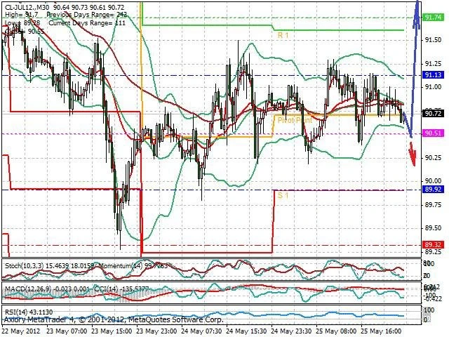 Předpokládaný pohyb pro dnešní den LONG. Případné vstupy do obchodu z hladiny 90.5 s předpokládaným cílem 92.2 případně až 92.8. Proražení hladiny 90.5 může vést k pohybu s pravděpodobným cílem 90.2 až 89.8.