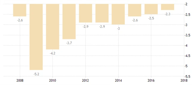 Vývoj rozpočtových deficitů Itálie (v % HDP), zdroj: Tradingeconomics.com