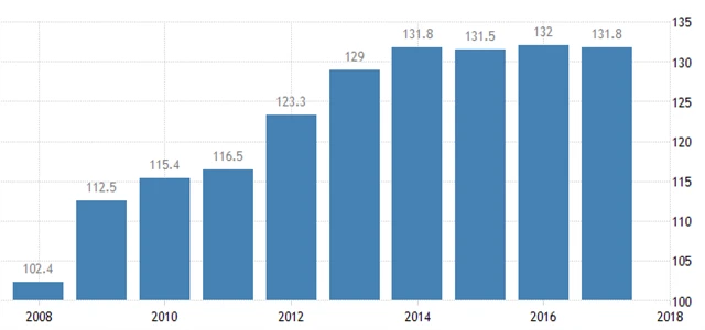 Míra vládního zadlužení Itálie (v % HDP), zdroj: Tradingeconomics.com