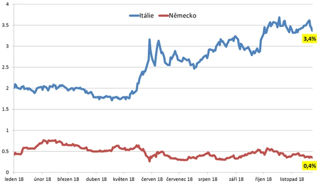 Německý státní dluhopis s 10letou splatností se letos obchoduje na poměrně stabilní úrovni s výnosem zhruba 0,5 %. Rozdíl (spread) mezi výnosem italského a německého státního dluhopisu tak logicky výrazně narostl. Na začátku roku se pohyboval pod 1,5 procentního bodu, nyní je okolo 3 procentních bodů.