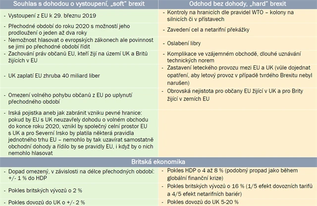 - Odchod UK z EU bez dohody (tvrdý brexit) má nyní větší pravděpodobnost než schválení dohody (měkký brexit). Otázkou je, do jaké míry se tvrdý brexit případně podaří změkčit přechodnými opatřeními.