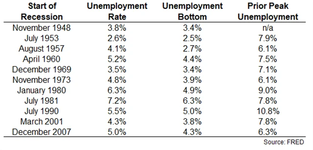 Ve všech uvedených případech také došlo k růstu nezaměstnanosti před vypuknutím recese, ale nelze přesně určit, o kolik musí nezaměstnanost vzrůst, aby přišla recese. Data bez kontextu nemají dostatečnou vypovídací hodnotu. A stejné jako s nezaměstnaností je to s inflací, úrokovými sazbami nebo oceněním akcií.
