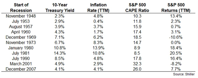 Úrokové sazby ani inflace také nemají žádnou kritickou hodnotu, která by upozorňovala na recesi. Ocenění akcií v dobách začátku recesí z let 1948, 1953, 1980 a 1981 bylo pro investory také příliš atraktivní na to, aby očekávali recesi.