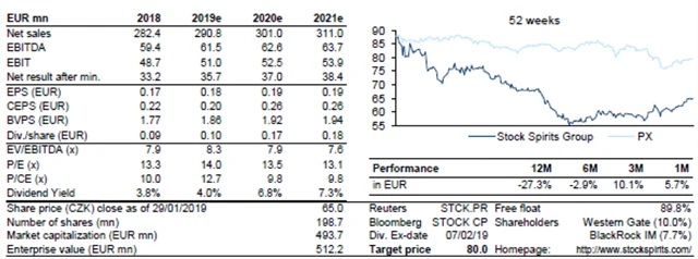 Stock Spirits z loňského zisku oznámila solidní dividendu (termín pro právo na výplatu dividendu je 7. února 2019), která ovšem byla pod původním odhadem Erste. Čisté zadlužení se snížilo na pouhý 0,53násobek čistého dluhu vůči zisku EBITDA.
