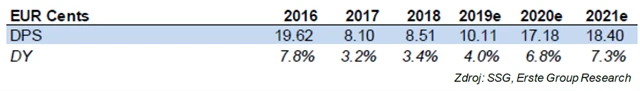 Společnost má "progresivní" dividendovou politiku, což dosud znamenalo 5% roční růst dividendy. Erste nicméně věří, že má firma vyšší dividendový potenciál, a odhaduje kumulovaný dividendový výnos za roky 2019-2021 na úrovni 23 %. Předpoklad je založen na cílovém zadlužení 0,5násobku čistého dluhu vůči EBITDA a upravený o možné ztráty plynoucí z probíhajících daňových vyšetřování.