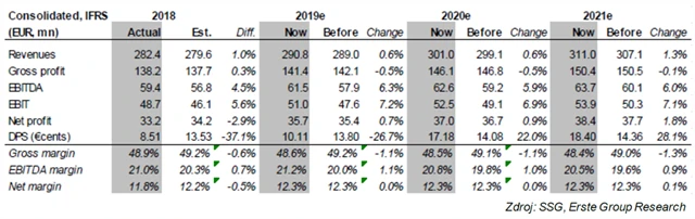 Odhady Erste se oproti těm loňským na úrovni tržeb či hrubého zisku příliš nezměnily. Na EBITDA měl pozitivní dopad pomalejší růst marketingových a administrativních nákladů, které rostou asi o polovinu pomaleji než tržby. To je na úrovni čistého zisku prakticky vyváženo vyšší efektivní daňovou sazbou. Menší dopad na odhady má i změna finančního roku z období od prosince do prosince na září-září (od roku 2018).