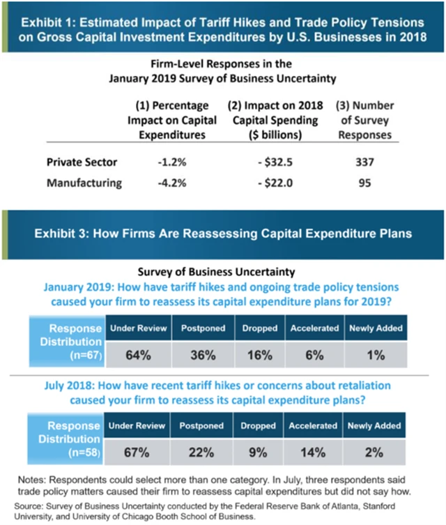 V případě USA je zpomalení způsobeno výpadkem pozitivních dopadů daňové reformy, normalizací úrokových sazeb a v neposlední řadě samotnou obchodní přestřelkou s Čínou. Americké firmy začaly ve světle obchodních válek přehodnocovat investice. Průzkumy americké centrální banky ukazují, že tento efekt snížil investice firem v soukromém sektoru o více než procento a ve zpracovatelském průmyslu o více než 4 %. Pro rok 2019 více než polovina firem hlásí, že investice odloží nebo zruší kvůli nejistotě spojené s obchodní válkou.