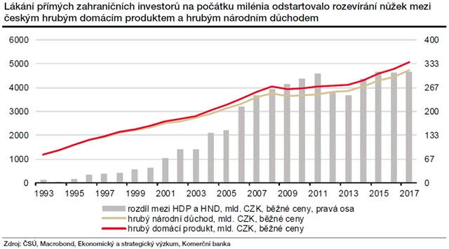 Pro rok 2017, za kdy jsou poslední kompletní data, skutečně platí, že národní důchod byl zhruba o 310 miliard korun nižší než celkový produkt v ekonomice vytvořený. To je důsledek toho, že se na tuzemské produkci podílejí firmy v držení zahraničních vlastníků i zahraniční zaměstnanci, kteří si za poskytnutý kapitál a práci řeknou o odpovídající podíl na ziscích a mzdách.