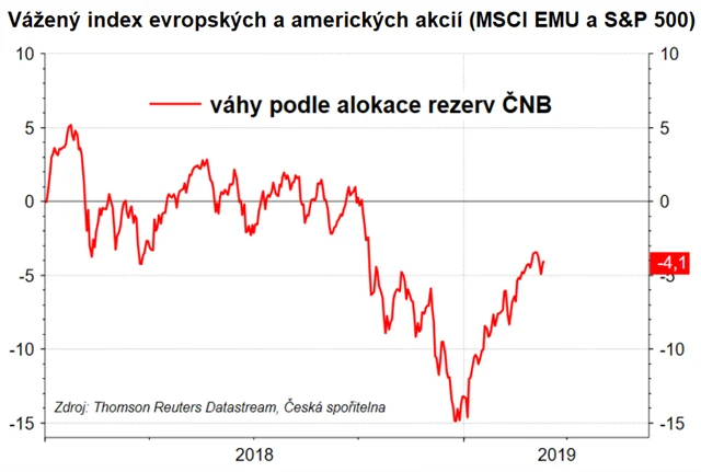 Proč? Zaprvé, 28 % devizových rezerv leží v centrálních bankách a u mezinárodních institucí a zhruba polovina v eurech, takže se záporným výnosem. Zadruhé, zhruba desetina rezerv je v akciích, které ke konci roku 2018 výrazně ztrácely. Zbytek portfolia (dolarové sazby, výnosy z dluhopisů) nemohl vykompenzovat tyto ztráty.