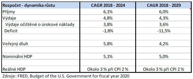 Tabulka níže zachycuje, jakže si to tým Donalda Trumpa představuje. První sloupec zachycuje průměrný vývoj jednotlivých proměnných v letech 2018-2024, druhý v období 2018-2029.