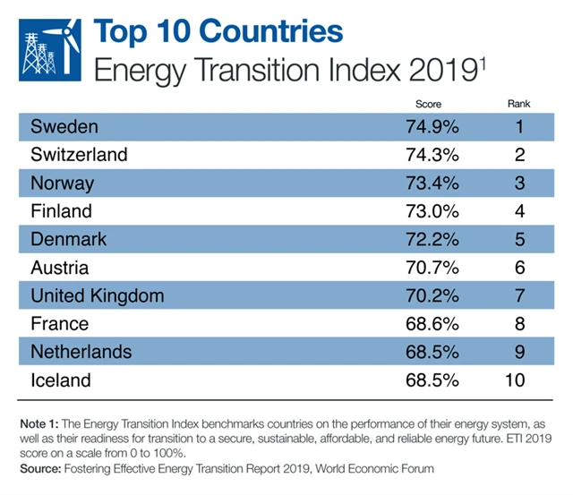 Žebříčku dominují země ze severní a západní Evropy. Tyto státy disponují diverzifikovaným mixem zdrojů energie a také vykazují kombinaci technologických výhod společně s efektivní tvorbou pravidel a jejich implementací. Mimochodem, USA jsou na 27. místě, Rusko na 79. místě, Česká republika na 49. a Slovensko na 33.).