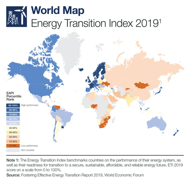 Na opačném konci řebříčku figurují země, v nichž chybí efektivní regulace a jež zároveň doplácejí na nestabilní politické prostředí. V kombinaci se závislostí na tradičních fosilních zdrojích energie a málo rozvinutou infrastrukturou v těchto zemích podle WEF chybí základy pro rozvoj podmínek vhodných k přechodu na nové zdroje energie. Exportéři fosilních paliv, jako jsou Nigérie, Mozambik a Venezuela, společně se zeměmi s velkou spotřebou uhlí, jako jsou Mongolsko a Jihoafrická republika, tak musejí překonávat velké bariéry při přechodu na obnovitelné zdroje energie.