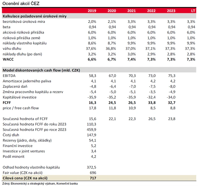 Ocenění akcií ČEZ jsme provedli na základě modelu diskontovaného volného cash flow. Fair value jsme odhadli na 696 Kč, cílová cena je stanovena o 3 % výše na 717 Kč díky sektorovému doporučení "nadvážit".