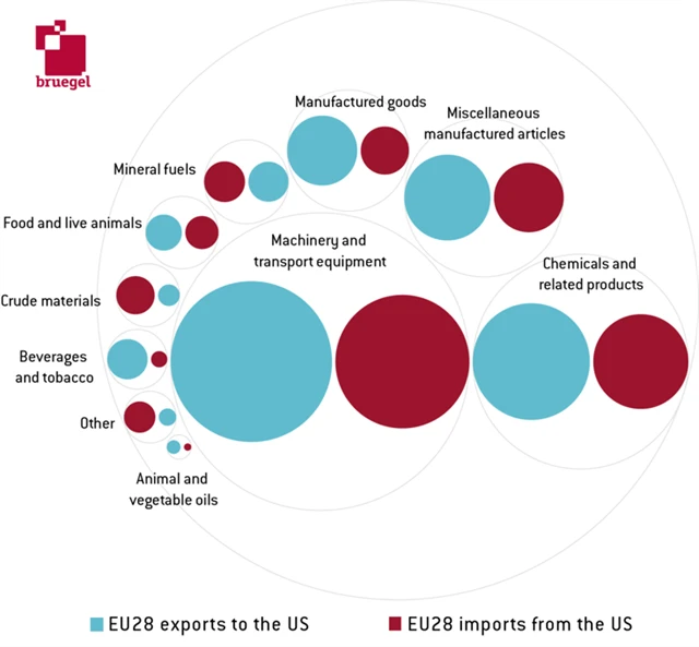 Zjednodušený pohled na vztahy obou hospodářských entit naznačuje nerovné partnerství a z něj vyplývající asymetrický dopad stupňujících se obchodních válek na zúčastněné. Pohled pod pokličku komplexní a komplikované reality globalizované ekonomiky 21. století ale nabízí jiný, plastičtější obrázek. To nedávno připomněl i obchodní ředitel Airbusu Christian Scherer, podle kterého firma dováží 40 % komponentů a expertízy z USA, a tak by jakékoli bariéry narušující toky v rámci stávajících řetězců měly "velice divoké" dopady na jejich americké články.