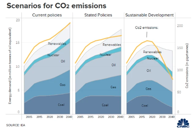 Navzdory této hrozbě zůstávají podle aktuálního Světového energetického výhledu úspory a zelené technologie ve stínu fosilních paliv. Ta loni uspokojila 70 % zmíněného nárůstu poptávky po energiích. Investice do alternativ (a v návaznosti na to jejich podíl na energetickém mixu) sice podle této zprávy mají růst, nikoli ovšem tempem odpovídajícím potřebám globální ekonomiky. Emise škodlivin se tak mají zvyšovat až do roku 2040, kdy by se mělo nejvýznamnějším zdrojem energie stát sluneční záření.