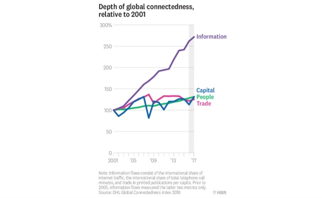 Podstata globálního obchodu se mění. Služby a související proměna struktury ekonomiky získávají na významu, což platí i pro Čínu a země jihovýchodní Asie. Ty se v rámci hodnotových řetězců posouvají od jednoduché výroby výše, díky službám přidávají větší hodnotu. Podíl mezinárodního obchodu s fyzickými produkty na globálním HDP se tedy sníží.