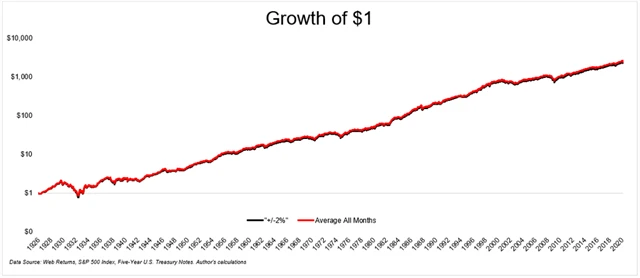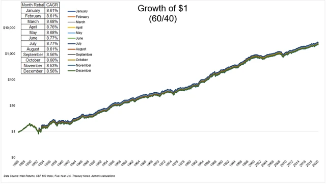 Metod, jak a podle čeho portfolio rebalancovat, je mnoho. Populární je samozřejmě strategie založená na kalendáři, tedy rebalancování vždy v určitý měsíc, tradičně v lednu nebo v prosinci. Jak přitom ukazuje tento graf, je docela jedno, kdy tak učiníte, rozdíly ve výkonnosti portfolia jsou u jednotlivých měsíců minimální.