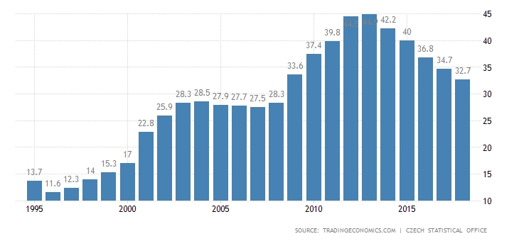 V mezinárodním srovnání jde o číslo přímo vzorně nízké (v pozadí může být třeba podinvestovanost české dopravní sítě nebo zoufale nízké platy českých učitelů, ale to nyní ponechme stranou). V rámci Evropské unie mají nižší dluh jen čtyři země, zbytek EU je na tom hůře. Třeba Německo coby zdánlivý vzor finanční opatrnosti má zadlužení oproti Česku téměř dvojnásobné. A průměr za celou eurozónu je dokonce téměř 90 % HDP.
