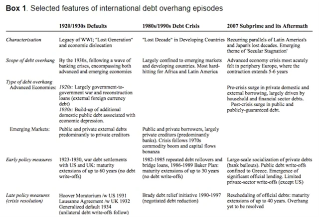 Zajímavá je i tabulka srovnání dosavadních dluhových krizí.