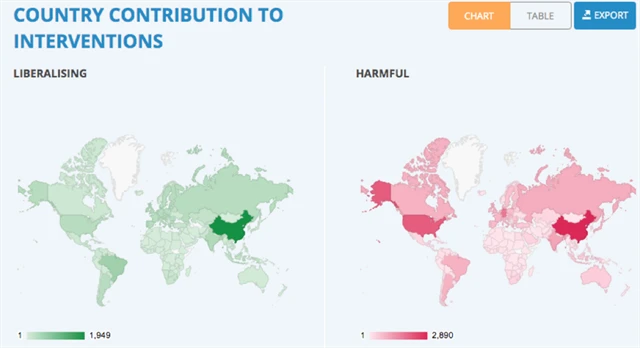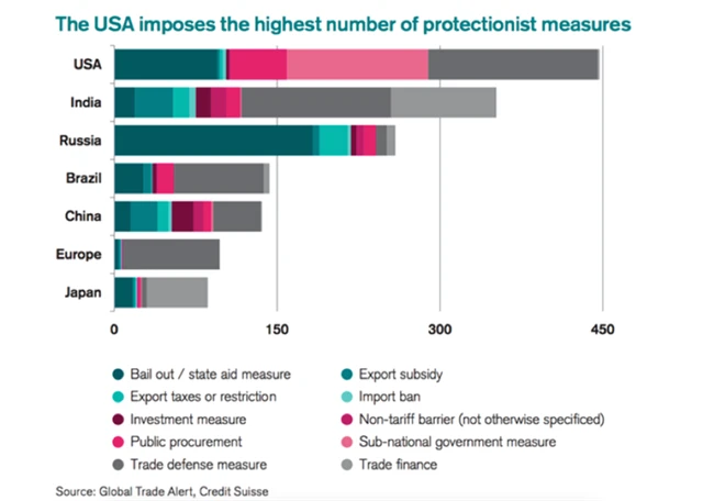 Počet obchodních bariér od turbulencí způsobených kolapsem hypotéčního trhu v USA v roce 2008 narůstá. Vyšší počet ochranářských opatření oproti těm liberalizačním každoročně přijímá většina systémově významných ekonomik. Pomyslným epicentrem (re)akce jsou USA a Čína, dvě mocnosti soupeřící o budoucí podobu světa.