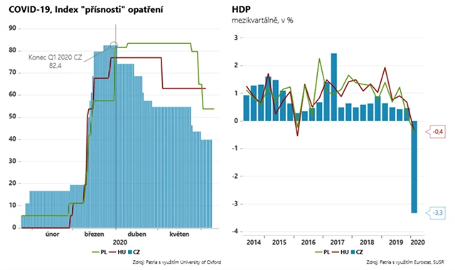 Index "přísnosti opatření" (podle univerzity v Oxfordu) byl na konci března v Česku v rámci regionu nejvýše. A to se nejvíce podepsalo zejména na investicích, které u nás spadly bezmála o 10 %, zatímco v Polsku a Maďarsku o necelé procento.