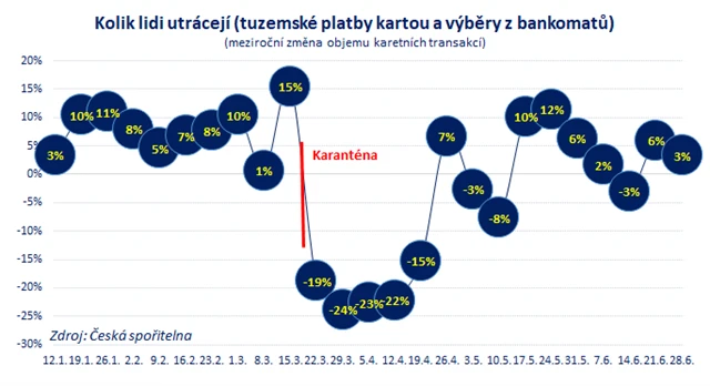 Na konci června karetní transakce (včetně výběrů z bankomatů) vzrostly v Česku meziročně o 1 %. V létě přitom tradičně roste podíl plateb (i výběrů z bankomatů) v zahraničí. Pokud se podíváme jen na tuzemské transakce, vidíme růst o 3 % (o týden dříve +6 %). To jsou nepochybně dobré zprávy ohledně oživení spotřeby českých domácností po zrušení plošné karantény.