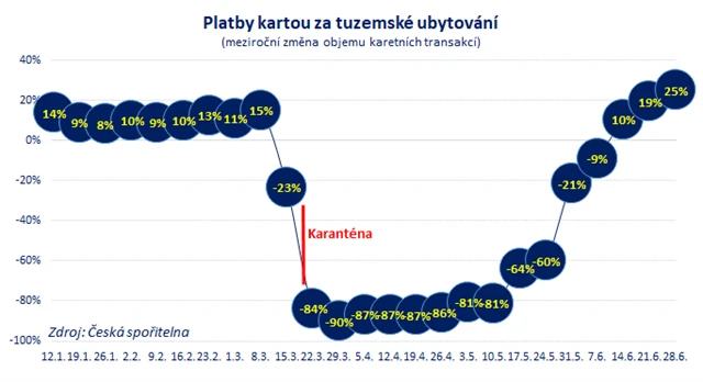 Co letos bude s transakcemi v zahraničí? Jednoduše řečeno, letos Češi utrácejí méně v zahraničí, ale část těchto peněz je utracena v Česku. To je pozitivní pro místní podnikatele, kterým budou chybět zahraniční hosté. Dobře je to vidět například na platbách kartou za ubytování (hotely, penziony, kempy). Za ubytování Češi zaplatili kartou o 28 % méně než loni. Nicméně pokud vyčleníme jen tuzemské platby, jsme meziročně na +25 %.