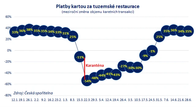 K tomu lze doplnit platby v restauracích v ČR. Ty vzrostly meziročně o 35 %.