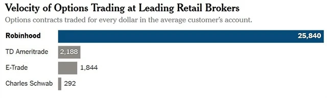 Je tedy možné, aby Robinhood, jehož valuace letos po posledním kole financování stoupla na více než 8 miliard dolarů a který vykazuje řádově vyšší četnost obchodů s opcemi než jeho konkurenti (ačkoli lze předpokládat, že v nesrovnatelně menších objemech), skutečně "akcentoval pohyby trhu", jak tvrdí Zero Hedge a další?