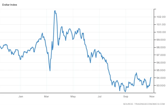 Trhy před volbami, které se konají již příští týden, taktizují, a tak americký dolar dále nepředvídatelně kolísá. Podle nejrůznějších průzkumů šance demokratů na opětovné získání převahy v Senátu v předchozím týdnu výrazně poklesly, ale v průběhu tohoto týdne opět stouply o něco výše. Zvláště poté, co víkendový průzkum naznačil, že Biden vede i v Texasu, tedy ve státě, který demokraté získali naposledy v roce 1976.