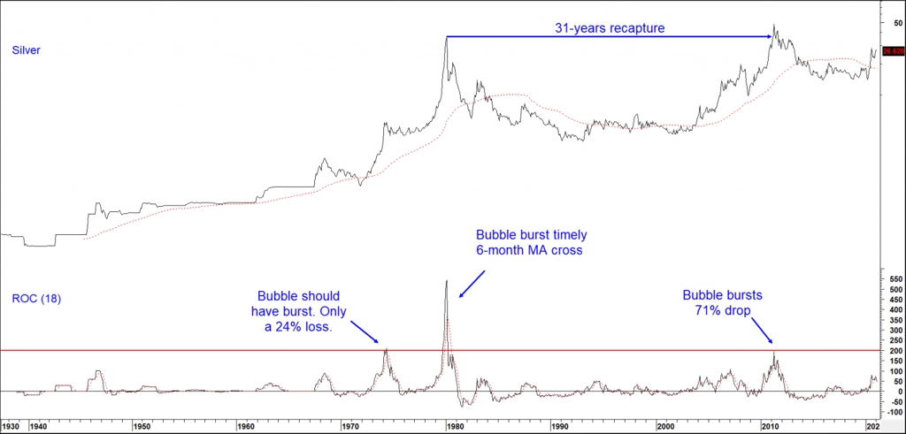 Následující graf ukazuje formování bublin na trhu se stříbrem. Mimo jiné je z něj také patrné, že prasknutí bubliny předchází zesílení růstu ceny a jeho přechod k (téměř) exponenciálnímu vývoji. Ani tento ukazatel však není bezchybný, jak ukazuje v případě stříbra vývoj z první poloviny 70. let 20. století.