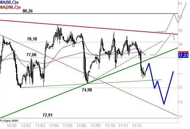 Cena ropy se stále pohybuje do strany v rámci býčí vlajkové formace s stále myslíme, že ji může opustit směrem nahoru. Předtím je ale třeba počítat s poklesem na $74,98. Očekáváme ještě protipohyb nahoru, pak ale může být pokořeno minimum z minulého pátku a ropa může spadnout až na $74,00. To pak nabízí šanci na odraz a opětovný růst kurzu.. Procyklický nákupní signál bude generovat až růst ceny na $79,00.