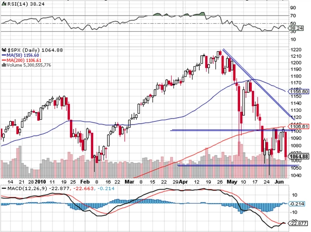 Trhy jsou i nadále volatilní, i když se stále pohybují ve stejném pásmu. Support, hladina, od které se cena indexu S&P 500 odráží nahoru, je na ceně 1 040 bodů. Jestliže bude tato hodnota proražena, očekáváme velký výprodej. Horní hranice současného rozpětí se vytvořila na ceně 1 105 bodů. Několikrát byla snaha o její proražení, ale zatím se vždy cena vrátila zpět. (6. 6. 2010)