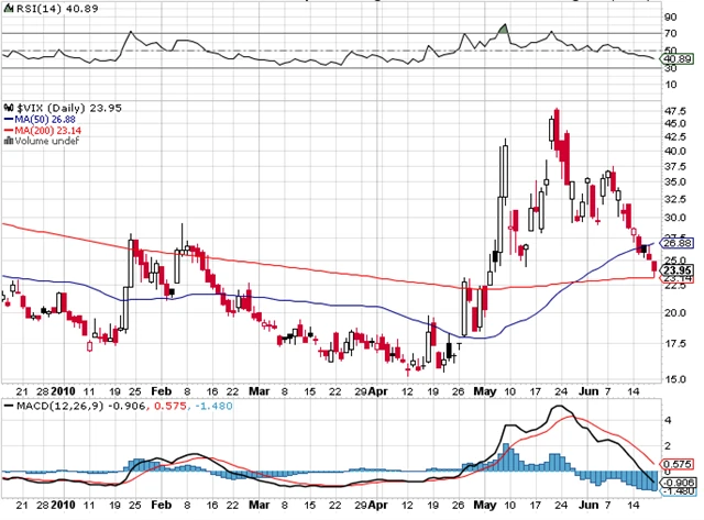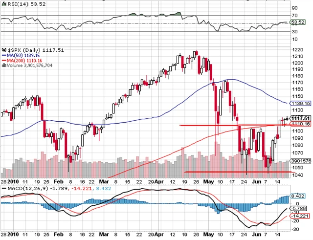 V úterý uzavřel index S&P 500 nad rezistencí (hladinou odporu) 1 105 bodů. Po tomto proražení uzavřel současně také nad 200denním klouzavým průměrem a je pravděpodobné, že se cena postupně dostane až k první rezistenci na úrovni 1 150. (20. 6. 2010)