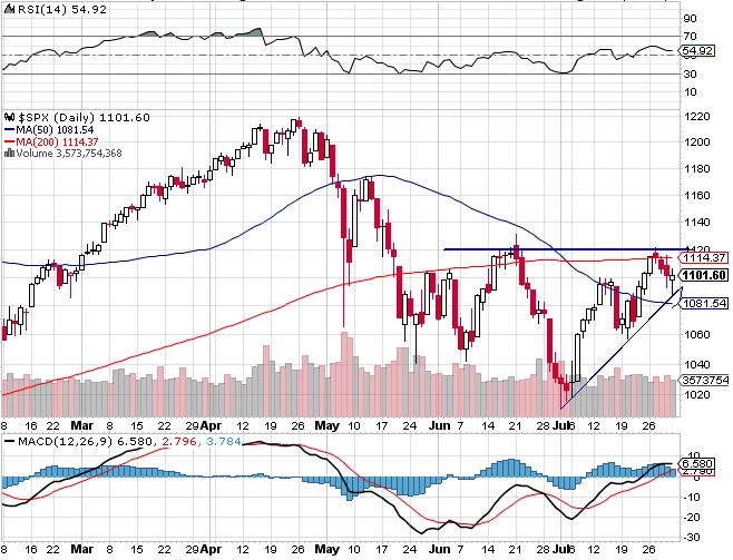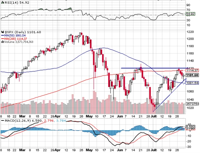 Silná rally, která proběhla koncem předcházejícího týdne a v pondělí 26.7., vytvořila podmínky k prodeji. Zároveň se index S&P 500 dostal na hranici odporu (rezistence), nad kterou nebyl schopný uzavřít a od které se odrazil zpět a následovaly tři červené svíčky. Není možné rozlišit, zda šlo jen o korekci z překoupených podmínek, nebo došlo ke střednědobému signálu k prodeji. (1. 8. 2010)