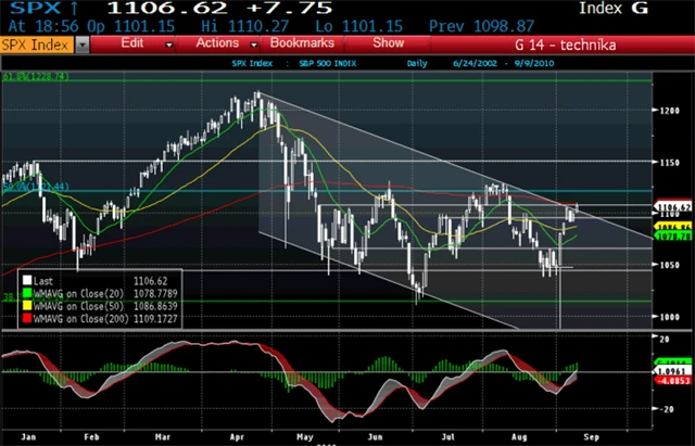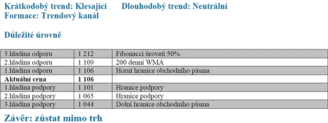 Index S&P 500 atakuje úrovně okolo 1 110 bodů, kde se nachází hned několik hladin odporu (viz tabulka). Nejdůležitější jevšak 200denní vážený klouzavý průměr. Jeho proražení by mohlo znamenat nárůst až na 1 120 bodů a udělat podobnémaximum jako v srpnu. Zatím však přesvědčivý break chybí, na druhou stranu dolů trh také nejde.