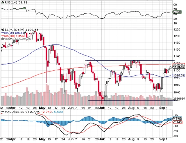 Září i v tomto týdnu pokračovalo v býčím směru. V úterý šel index S&P 500 dolů téměř k uzavření gapu. Následující tři dny byly opět svíčky nahoru a cena se blíží hladině odporu v oblasti 1 120 až 1 130 bodů. Je nutné připomenout, že takto pozitivní situace byla letošní léto několikrát. Potom vždy tento vývoj brzy skončil a cena se vydala opačným směrem.