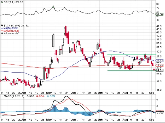 Index volatility VIX šel v týdnu od 30. 8. do 3. 9. výrazně dolů a páteční cena byla nejnižší od počátku května. Ovšem hned první obchodní den po státním svátku se index vrátil zpět do svého obchodního rozpětí 22 až 29 bodů, ve kterém se nachází už od začátku července.