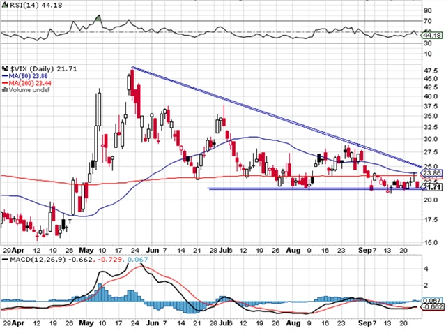 Index volatiliy VIX není ještě tak pozitivní jako S&P 500. Zatím i po páteční rally drží své cenové rozpětí.