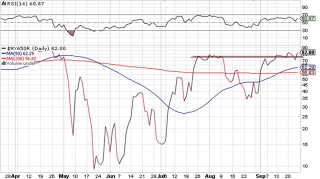 Na grafu, který ukazuje překoupenost trhu, je vidět, kolik procent akcií z burzy NYSE je nad svým 50denním klouzavým průměrem. Nyní jsme na hodnotě 82 %.