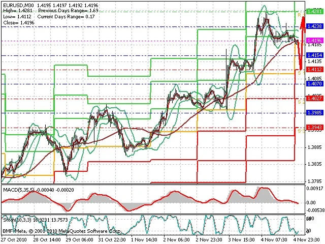Předpokládaný pohyb pro dnešní den LONG. Případné vstupy do obchodu z hladiny 1.4117 s předpokládaným cílem 1.4246, případně až 1.4305. Při proražení hladiny 1.411 se otevře cesta k 1.406 až 1.3995.