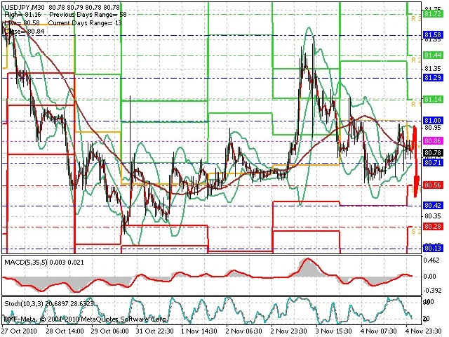 Předpokládaný pohyb pro dnešní den SHORT. Případné vstupy do obchodu z hladiny 80.95 s předpokládaným cílem 80.6, případně až 80.45. Při proražení hladiny 81.0 se otevře cesta k 81.15 až 81.3.