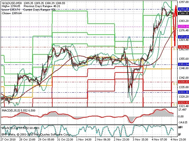 Předpokládaný pohyb pro dnešní den LONG. Případné vstupy do obchodu z hladiny 1365 s předpokládaným cílem 1400, případně až 1410. Při proražení hladiny 1365 se otevře cesta k 1347 až 1335.