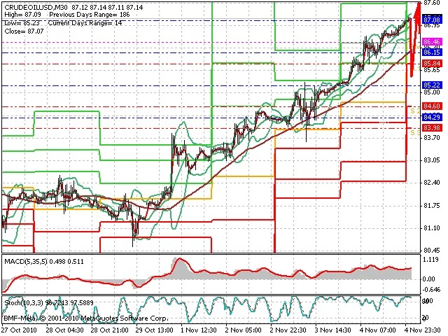 Očekáváme vývoj LONG, případné vstupy do obchodu z hladiny 85.5 s předpokládaným cílem 87.6 až 89. Proražení hladiny 85.5 může vést k pohybu s pravděpodobným cílem 84.53 až 83.55.